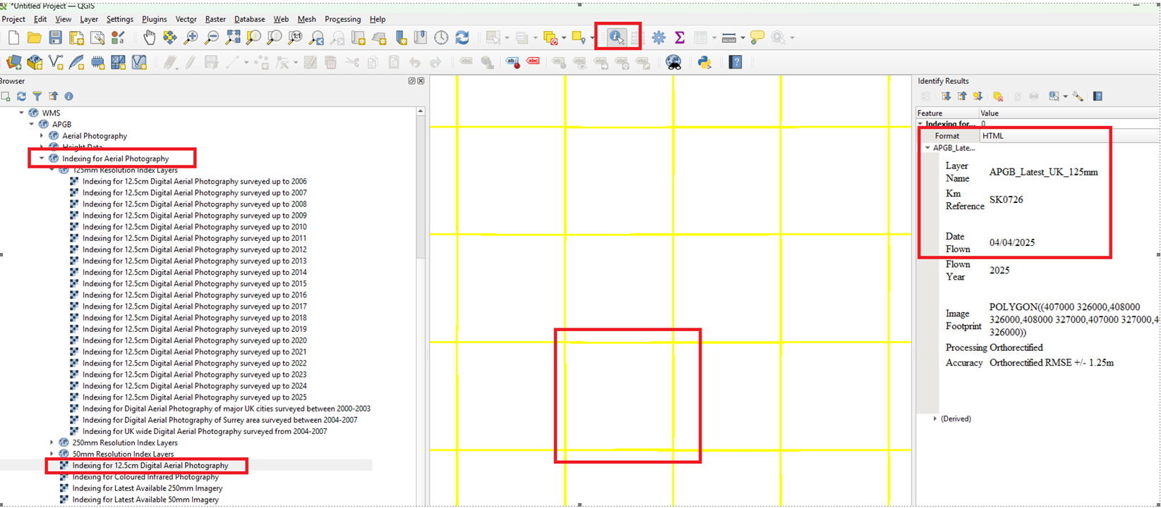 This is a screenshot from QGIS to show how the layers are arranged. Most GIS software works in a similar way with the WMS. IN QGIS you will need to select the information button to interrogate the Index Layer Grid to reveal the date of capture.